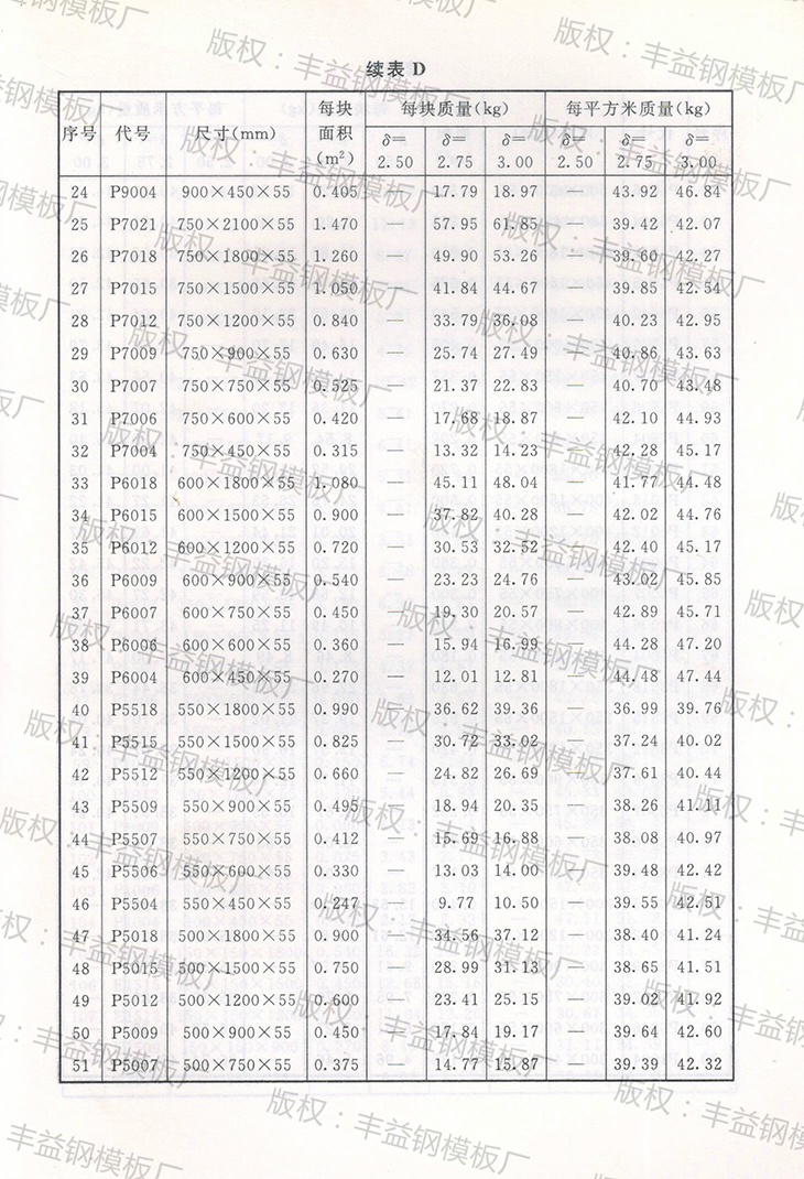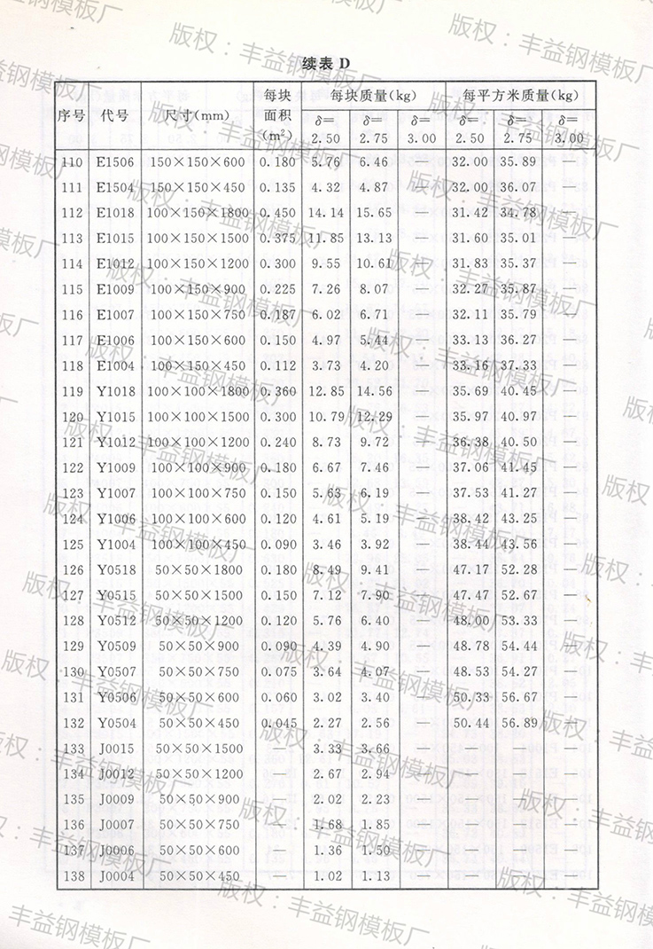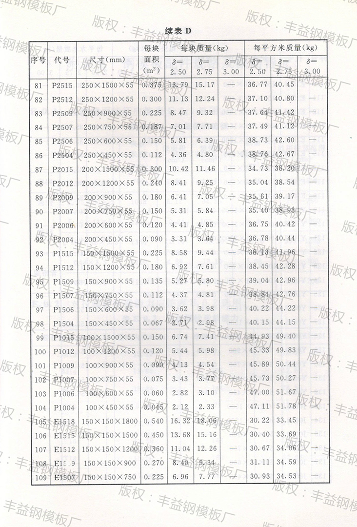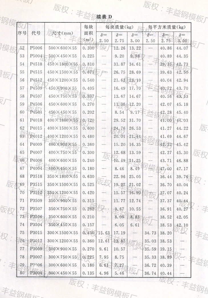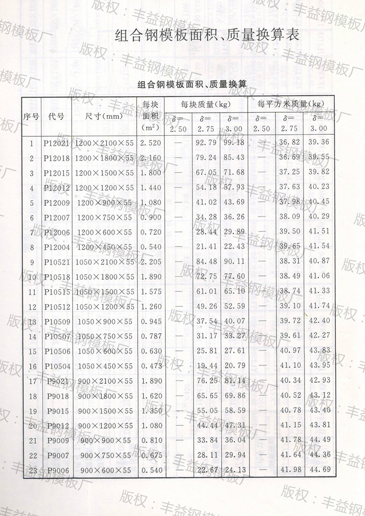 钢模板理论重量表(钢模板面积、质量换算表)